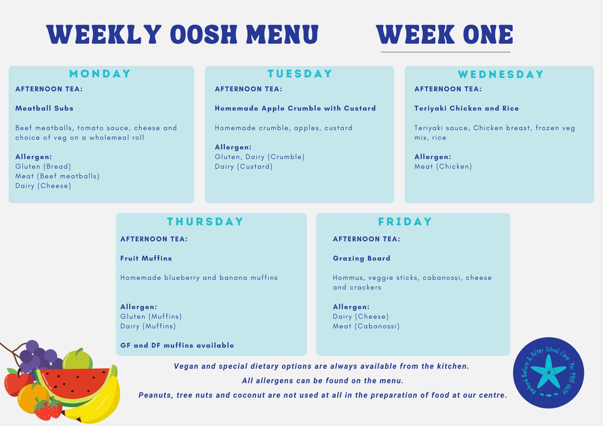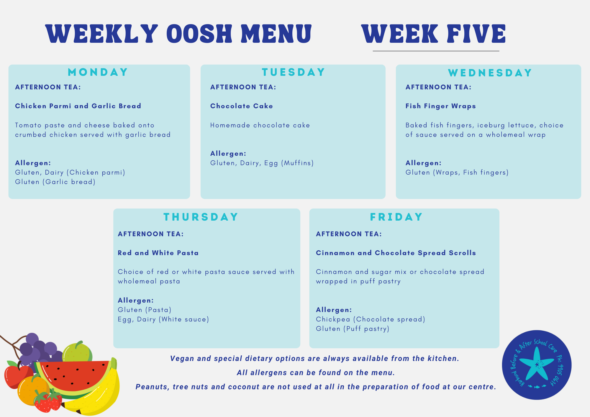 Our meals are planned using a five-week rotating menu developed in consultation with a dietitian. This menu will be used across Term 1 and is designed to provide balanced, nutritious meals for children.
