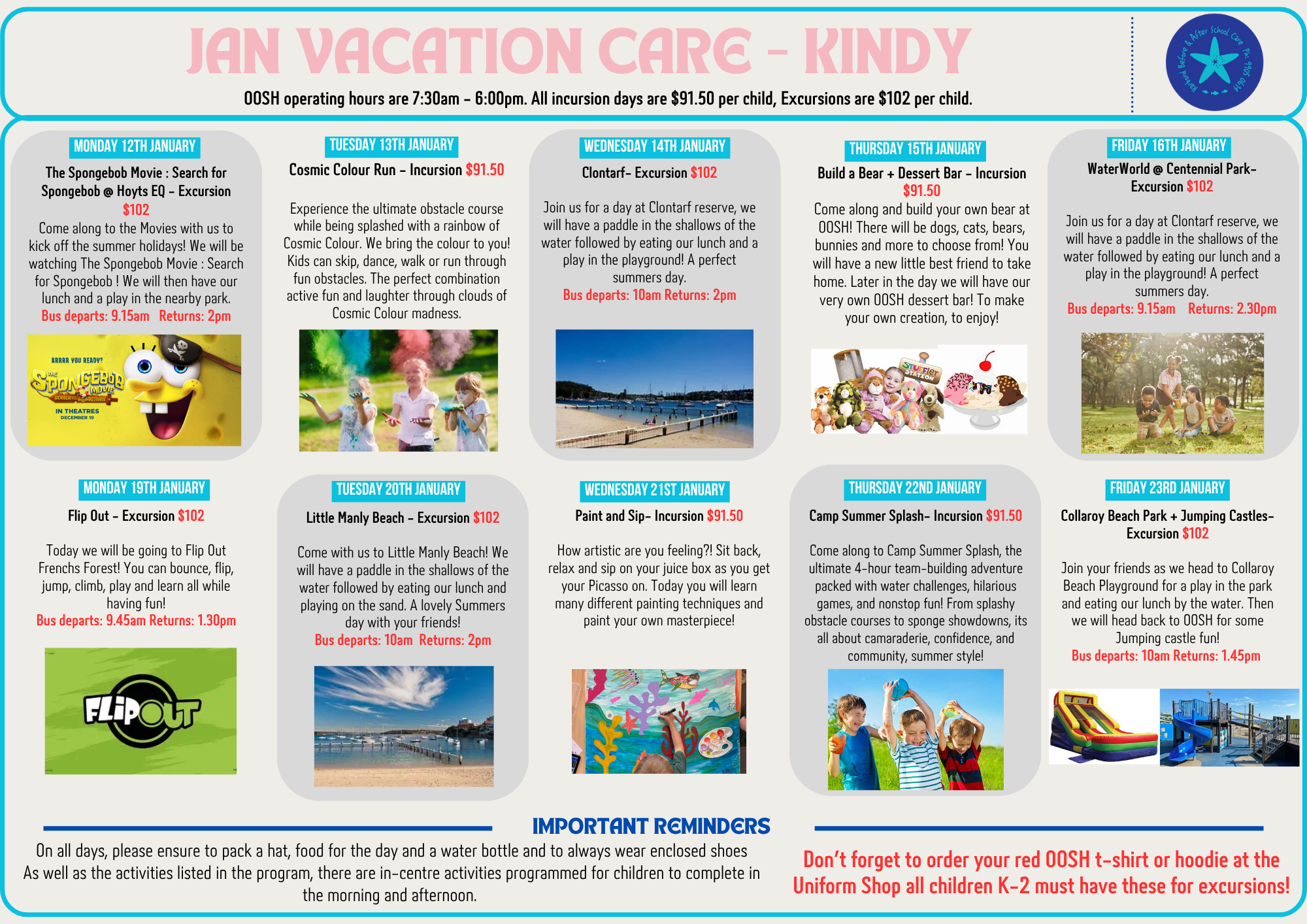 All Kindy, Year 1 and Year 2 children must wear the red OOSH shirt or jumper for excursions.